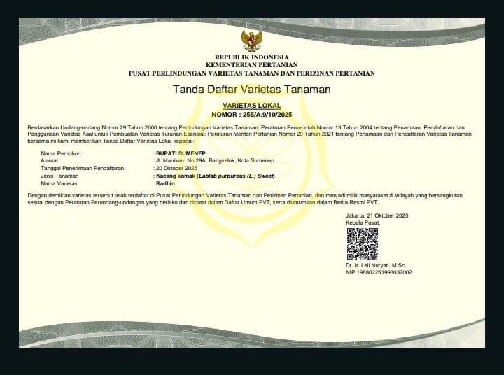 Ia menambahkan, pengakuan nasional ini menjadi bukti bahwa komoditas pertanian lokal Sumenep memiliki kualitas, karakteristik, dan daya saing yang kuat. Ke depan, status varietas unggul nasional tersebut diharapkan dapat mendorong pengembangan budidaya secara lebih luas, memperkuat sistem perbenihan, serta membuka peluang pasar yang lebih besar.
