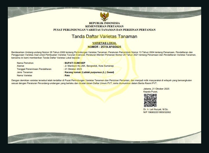 Berita Madura — Kabupaten Sumenep kembali mencatatkan prestasi di sektor pertanian. Tiga varietas kacang komak lokal asal Sumenep resmi ditetapkan sebagai varietas unggul nasional oleh Pusat Perlindungan Varietas Tanaman dan Perizinan Pertanian (PPVTPP) Kementerian Pertanian Republik Indonesia.