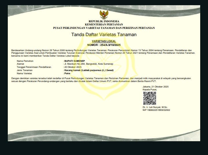 “Penetapan Kacang Komak Potre, Kacang Komak Rato, dan Kacang Komak Radhin sebagai varietas unggul nasional merupakan langkah strategis dalam melindungi kekayaan plasma nutfah daerah sekaligus meningkatkan nilai tambah ekonomi bagi petani Sumenep,” ujar Chainur Rasyid.